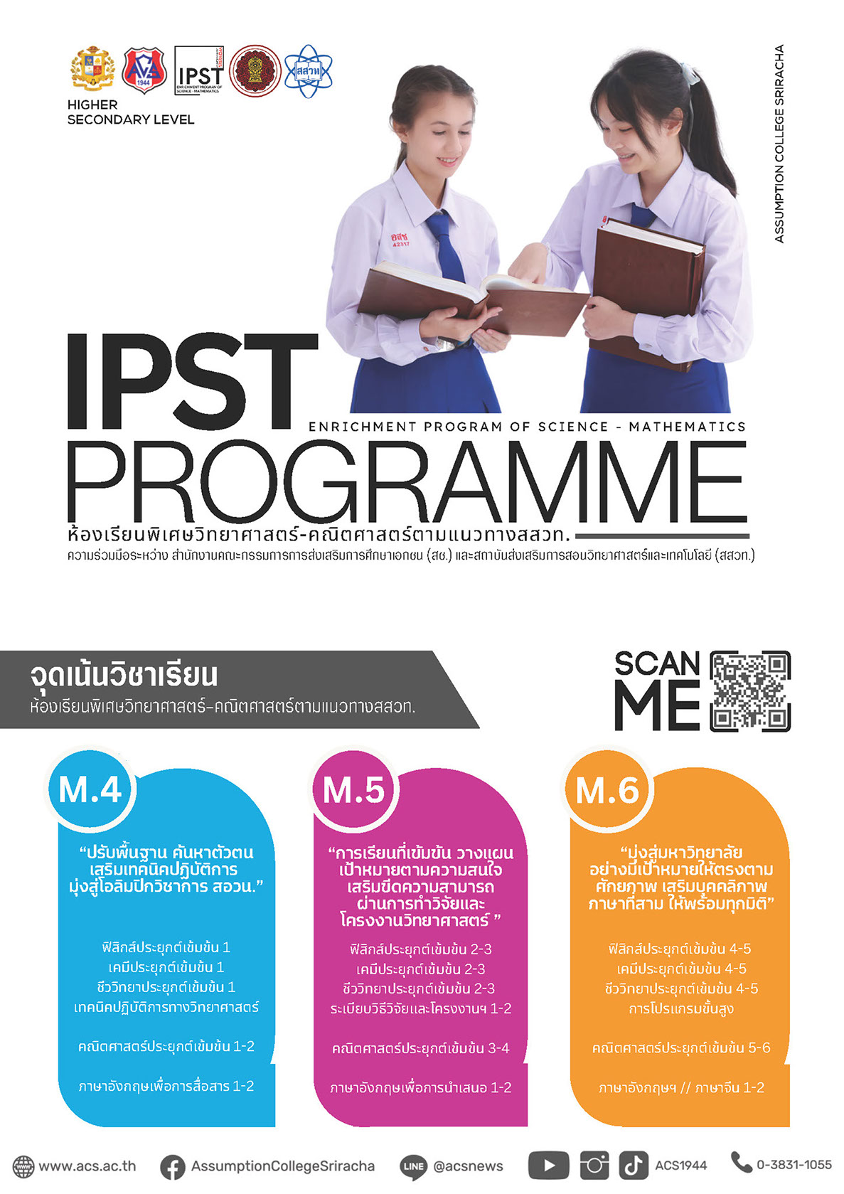 เราเชื่อมั่นว่า ACS IPST Program พร้อมสร้างทุกบริบทของการเรียนรู้ที่จะสนับสนุนให้นักเรียนที่รักของเรา ก้าวไปสู่คำว่า “ Your dreams, Your success, Our Challenges ” แล้วมาเป็นครอบครัวเดียวกับเรานะคะห้องเรียนพิเศษวิทยาศาสตร์และคณิตศาสตร์ตามแนวทางสสวท.
