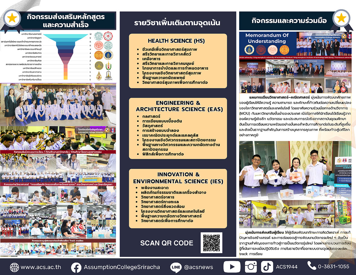 วิทย์ - คณิต ที่อัสสัมชัญศรีราชาได้ให้อะไรเยอะมาก ทั้งความรู้ใหม่ ๆ ที่น่าสนใจมีมิส-มาสเตอร์ ที่คอยช่วยให้คำปรึกษา และคอยช่วยเหลืออยู่เสมอ เรามีเพื่อนที่น่ารัก ช่วยกันเรียน ชวนกัน ทำกิจกรรมอยู่ตลอดทั้งหมดนี้ สามารถนำไปต่อยอดในอนาคต ได้อย่างดี นางสาวโชติรส โชติกเสถียร คณะวิศวกรรมศาสตร์ สถาบันเทคโนโลยีนานาชาติสิรินธร (SIIT) มหาวิทยาลัยธรรมศาสตร์